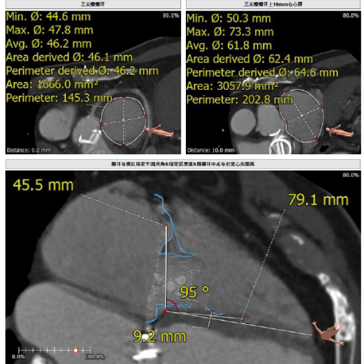 接受本次治療的是一例三尖瓣重度反流的患者,NYHA心功能Ⅲ級。主訴“反復(fù)活動后氣促1年,下肢水腫4個月”。入院N末端B型腦鈉肽前體(NT-proBNP)3161pg/ml。心電圖提示:心房顫動,ST-T改變。術(shù)前超聲提示:重度三尖瓣關(guān)閉不全,右心房擴(kuò)大,三尖瓣收縮期位移(TAPSE)14mm,左房增大,左室收縮功能正常低值,主動脈瓣、二尖瓣機(jī)械瓣功能良好。術(shù)前CT評估(圖1):三尖瓣瓣環(huán)(周長換算直徑)大小為46.2mm;入路血管無嚴(yán)重迂曲,無鈣化;雙側(cè)冠脈有鈣化。
