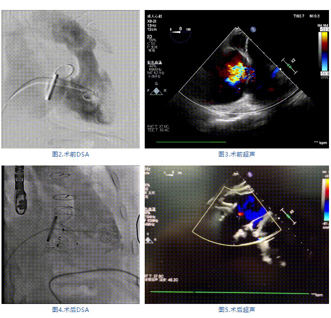 手術(shù)在全麻狀態(tài)下進(jìn)行,郭惠明教授團(tuán)隊(duì)采用經(jīng)右側(cè)頸靜脈入路的方式送入輸送器進(jìn)入體內(nèi),并在TEE和DSA的指引下進(jìn)行。在輸送器進(jìn)入右室后釋放室間隔錨定裝置,旋轉(zhuǎn)輸送器,使得錨定裝置對準(zhǔn)室間隔面;而后釋放前瓣夾持件,確定夾持件位于右室側(cè)釋放LuX-Valve Plus人工瓣膜盤片,再使用DSA和超聲確認(rèn)盤片是否位于右房側(cè),同時調(diào)整瓣膜的同軸性。緊接著在DSA和超聲的監(jiān)視下調(diào)整室間隔錨定件貼合室間隔,釋放室間隔錨定裝置。再次確認(rèn)瓣膜的穩(wěn)定性和同軸性后,將輸送器撤出體內(nèi),最終完成LuX-Valve Plus人工瓣膜植入(圖2-5),手術(shù)獲得圓滿成功?;颊咴谑中g(shù)室即刻拔除氣管插管,術(shù)后超聲提示LuX-Valve Plus人工三尖瓣瓣膜同軸性良好,瓣架固定牢靠,無反流和瓣周漏。