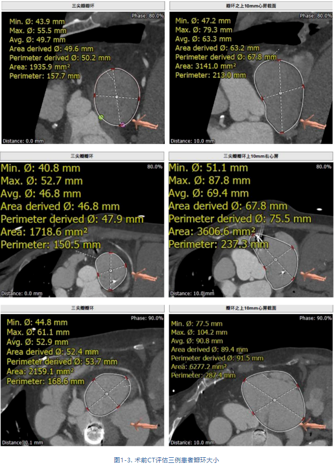 接受治療的是三例重度三尖瓣反流患者,術(shù)前基礎(chǔ)疾病多,均患有嚴(yán)重心律失常,其中兩例患者NYHA心功能Ⅱ/Ⅲ級。結(jié)合術(shù)前CT評估結(jié)果,三例患者的自體瓣環(huán)都較大(圖1-3),最大者平均瓣環(huán)為53.7mm;有一例患者有起搏器植入史,術(shù)中操作有纏繞起搏器導(dǎo)線的風(fēng)險;三例患者入路血管均無嚴(yán)重迂曲和鈣化。經(jīng)術(shù)前討論分析,潘湘斌教授及其團隊潘家華教授、朱達教授、王首正教授以及心超室的駱志玲教授,董念國教授及其團隊謝明星教授、尚小珂教授、陳澍教授、鐘禹成教授經(jīng)過討論決定,采用創(chuàng)新的 LuX-Valve Plus經(jīng)血管三尖瓣置換系統(tǒng)對患者進行手術(shù)。LuX-Valve Plus是我國自主研發(fā)的經(jīng)血管介入三尖瓣置換系統(tǒng),經(jīng)頸靜脈入路的微創(chuàng)方式可進一步降低對患者的創(chuàng)傷。