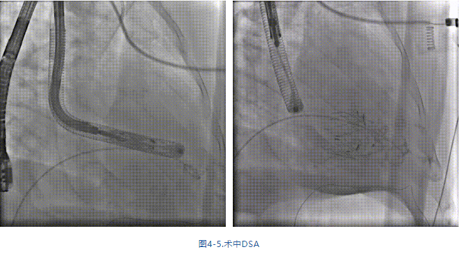 手術(shù)在全麻狀態(tài)下進行,采用經(jīng)右側(cè)頸靜脈入路,在TEE和DSA的指引下緩慢送入輸送器進入體內(nèi),進入右室后釋放室間隔錨定裝置,旋轉(zhuǎn)輸送器,使得錨定裝置對準(zhǔn)室間隔面;釋放前瓣夾持件,確定夾持件位于右室側(cè)后釋放人工瓣膜盤片,DSA及超聲確認(rèn)盤片位于右房側(cè),并適時調(diào)整瓣膜的同軸性。在DSA和超聲的監(jiān)視下調(diào)整室間隔錨定件貼合室間隔,釋放室間隔錨定裝置。再次確認(rèn)瓣膜的穩(wěn)定性和同軸性后,將輸送器撤出體內(nèi),最終完成瓣膜植入(圖4-5),手術(shù)室即刻拔除氣管插管。術(shù)后超聲提示人工三尖瓣同軸性良好,瓣架固定牢靠,無反流和瓣周漏,術(shù)后三尖瓣平均跨瓣壓差顯著降低。