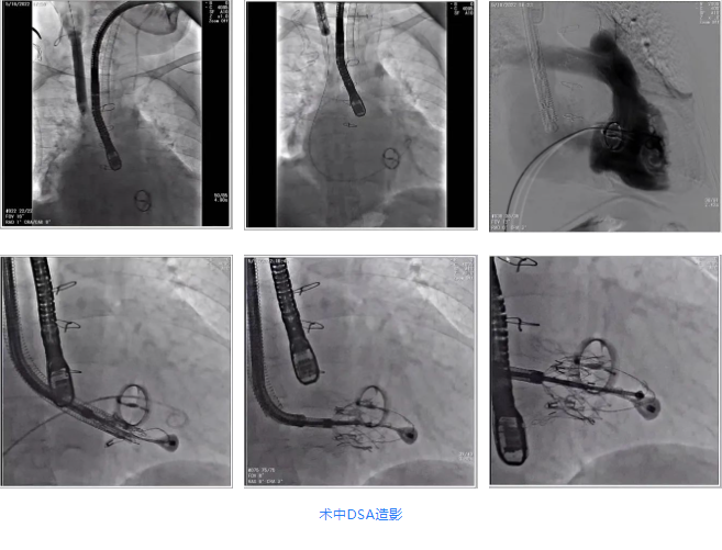 根據(jù)術(shù)前評估結(jié)果,郭應(yīng)強教授團隊為患者量身定制了手術(shù)策略,決定使用LuX-Valve Plus經(jīng)血管三尖瓣置換系統(tǒng)開展手術(shù)治療。手術(shù)在全麻下進行,采用經(jīng)右側(cè)頸靜脈入路,在經(jīng)食道超聲和DSA的指引下調(diào)整輸送器角度以達到正確位置,勾住前瓣后逐步釋放盤片,盤片打開后順利扎針,最終完成瓣膜植入,輸送器撤出。術(shù)后超聲提示人工三尖瓣同軸性良好,瓣架固定牢靠,無反流和瓣周漏,術(shù)后三尖瓣平均跨瓣壓差為1 mmHg。