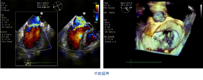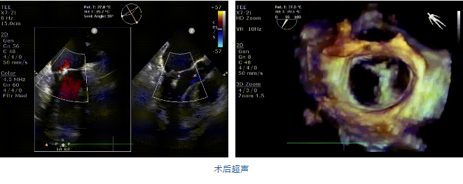在阜外醫(yī)院潘湘斌教授團(tuán)隊(duì)的支持下,手術(shù)經(jīng)股靜脈-房間隔入路,采用全身麻醉插管,在TEE和DSA引導(dǎo)下完成房間隔穿刺。置入JensClip瓣膜夾系統(tǒng)后,在左房調(diào)整瓣膜夾的位置和軸向,后進(jìn)入左室,在TEE引導(dǎo)下捕捉二尖瓣前后瓣葉,并關(guān)閉瓣膜夾。經(jīng)TEE反復(fù)確認(rèn)手術(shù)效果后最終鎖定并釋放瓣膜夾。術(shù)后即刻超聲顯示瓣膜夾位置穩(wěn)定,功能良好,二尖瓣反流由術(shù)前4+減少至微量,手術(shù)圓滿成功。