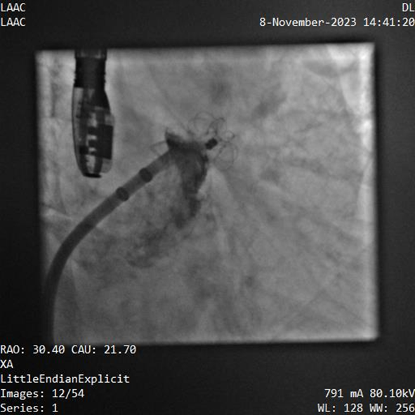 該例患者為男性58歲,陣發(fā)性房顫,9個月前突發(fā)急性腦梗死,3月前曾行房顫射頻消融術。2023年11月經胸超聲心動圖示左房內徑46mm,經食道超聲心動圖示左心房及左心耳內未見血栓形成,CHA2DS2-VASc評分3分,HAS-BLED評分2分。DSA測得左心耳開口直徑約23mm,錨定區(qū)域約18mm。