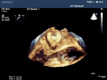 術后TEE三維重建影像示封堵器位置佳,封堵完全