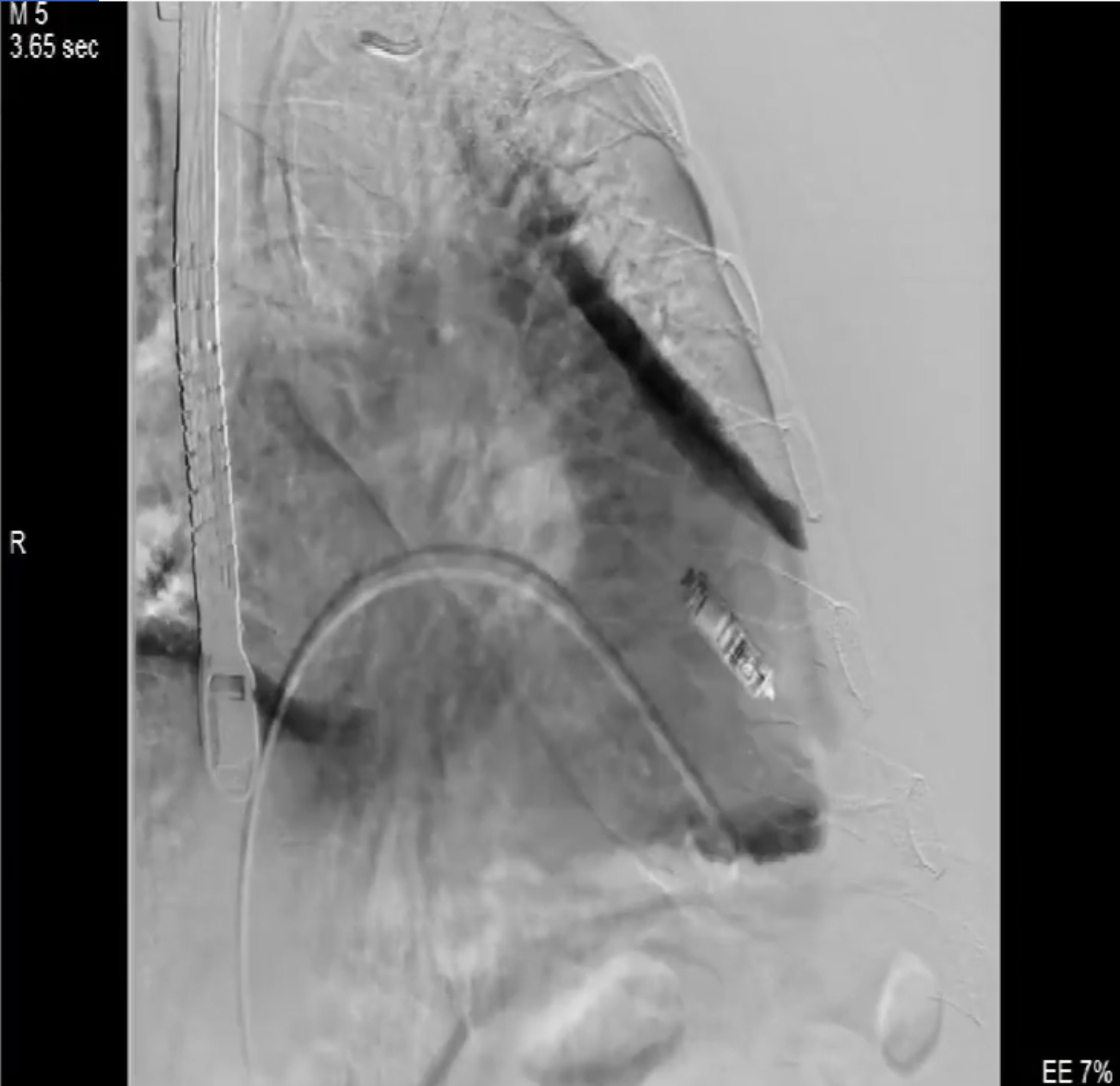 術(shù)前DSA造影可見(jiàn)三尖瓣大量返流呈瀑布樣,右室偏間隔側(cè)可見(jiàn)無(wú)導(dǎo)線(xiàn)起搏器一枚。