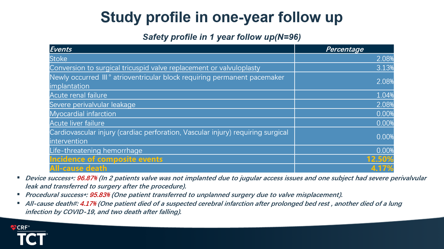 安全性結果顯示,復合事件發(fā)生率為12.50%。心梗、使用ECMO(體外膜肺氧合)或IABP(主動脈內球囊反搏)、急性肝功能衰竭、長期機械通氣(>72小時)、需要外科干預的心血管損傷(心臟穿孔、血管損傷)、危及生命的大出血事件發(fā)生率均未發(fā)生。全因死亡率僅為4.17%,急性腎臟衰竭、重度瓣周漏和中轉外科三尖瓣置換或成形術發(fā)生率分別為1.04%、2.08%和3.13%。新發(fā)III度房室傳導阻滯需植入永久心臟起搏器的發(fā)生率僅2.08%。