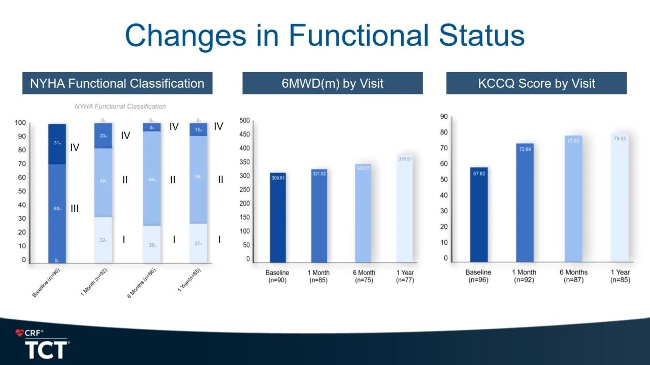 NYHA心功能改善方面,30天數(shù)據(jù)顯示約80%的患者由術前 III/IV 級提升至 I/II 級,1年期數(shù)據(jù)顯示約85%的患者由術前 III/IV 級提升至 I/II 級。在生活質量方面,患者堪薩斯城心肌病變問卷(KCCQ)評分在30天平均提升15分,在1年期平均提升21分。有效性結果顯示患者的心功能和生活質量持續(xù)改善。