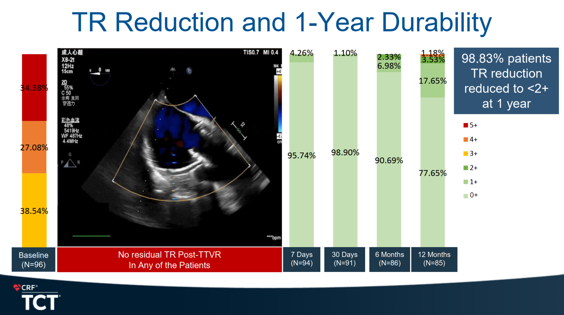 有效性結(jié)果顯示,患者的返流等級、心功能等級,以及生活質(zhì)量顯著改善。所有受試者在30天顯示無中度及以上返流,95.30%的患者在1年期時顯示無中度及以上返流。同時,根據(jù)超聲數(shù)據(jù)顯示,患者右心系統(tǒng)重構(gòu)也獲得受益。