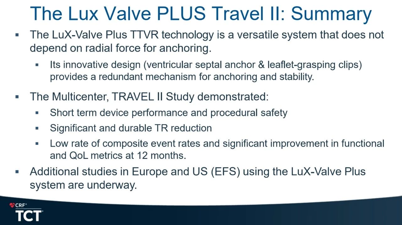 Granada教授表示,LuX-Valve Plus 是一款不依賴于徑向支撐力固定的多功能 TTVR 器械,它的創(chuàng)新設計(室間隔錨定和瓣葉夾持件)提供了多樣的固定和穩(wěn)定技術。多中心臨床試驗研究 TRAVEL II 展現(xiàn)了 LuX-Valve Plus 的安全性和有效性,能實現(xiàn)較短的器械操作時間,較低的復合事件發(fā)生率。1年期的數(shù)據(jù)延續(xù)了6個月數(shù)據(jù)的優(yōu)異結(jié)果,顯示了其長久的可靠性,尤其是1年期時顯著降低三尖瓣返流等級,以及帶來心功能和生活質(zhì)量等指標的明顯改善。