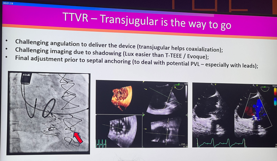 巴西圣保羅(Rede D'Or São Luiz, São Paulo, Brazil)的 Vinicius Esteves 教授結(jié)合了二例 LuX-Valve Plus 的植入案例探討了經(jīng)頸靜脈入路在TTVR中的優(yōu)勢。通過對比傳統(tǒng)經(jīng)股靜脈入路和經(jīng)頸靜脈入路,經(jīng)頸靜脈入路因為更短的路徑可以減少手術(shù)風(fēng)險、縮短手術(shù)時間,并顯著降低術(shù)后并發(fā)癥;且更易對瓣膜的軸向性進行調(diào)整,以降低瓣周漏的發(fā)生。同時,由于經(jīng)頸靜脈入路并未產(chǎn)生更多的血管并發(fā)癥,越來越多的三尖瓣置換器械也在進行經(jīng)頸靜脈入路的探索,展現(xiàn)了三尖瓣置換未來趨勢的一種可能性。LuX-Valve Plus作為頸靜脈入路TTVR器械的早期探索者,積累了非常豐富的臨床經(jīng)驗。