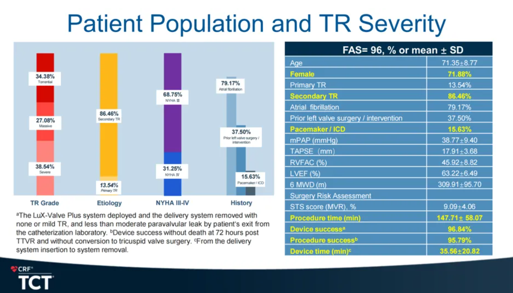 TRAVEL II研究主要用于評估LuX-Valve Plus在重度三尖瓣反流患者中應(yīng)用的長期安全性和有效性。TRAVEL II臨床試驗(yàn)共納入了中國15家臨床中心的96例患者。患者平均年齡為71.35歲,平均STS評分為9.09%,37.50%的患者在研究前接受了左心瓣膜手術(shù),15.63%的患者存在起搏器植入史,同時(shí)多合并其他基礎(chǔ)病,基線情況較差,存在較高的外科手術(shù)風(fēng)險(xiǎn)和接受其他介入治療方式的難度。