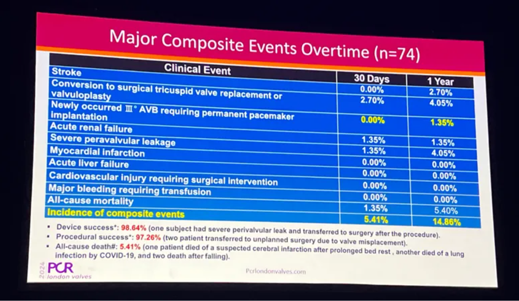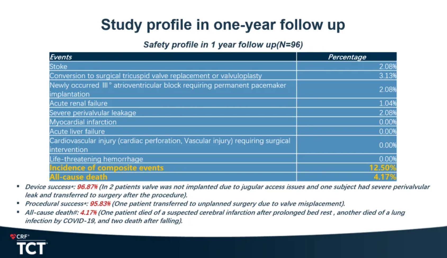 安全性結(jié)果顯示,復(fù)合事件發(fā)生率為12.50%,依然維持在較低水平。心梗、使用ECMO(體外膜肺氧合)或IABP(主動(dòng)脈內(nèi)球囊反搏)、急性肝功能衰竭、長期機(jī)械通氣(>72小時(shí))、需要外科干預(yù)的心血管損傷(心臟穿孔、血管損傷)、危及生命的大出血事件發(fā)生率均為0%。全因死亡率僅為4.17%,急性腎臟衰竭、重度瓣周漏和中轉(zhuǎn)外科三尖瓣置換或成形術(shù)發(fā)生率分別為1.04%、2.08%和3.13%。新發(fā)III度房室傳導(dǎo)阻滯需植入永久心臟起搏器的發(fā)生率僅2.08%。
