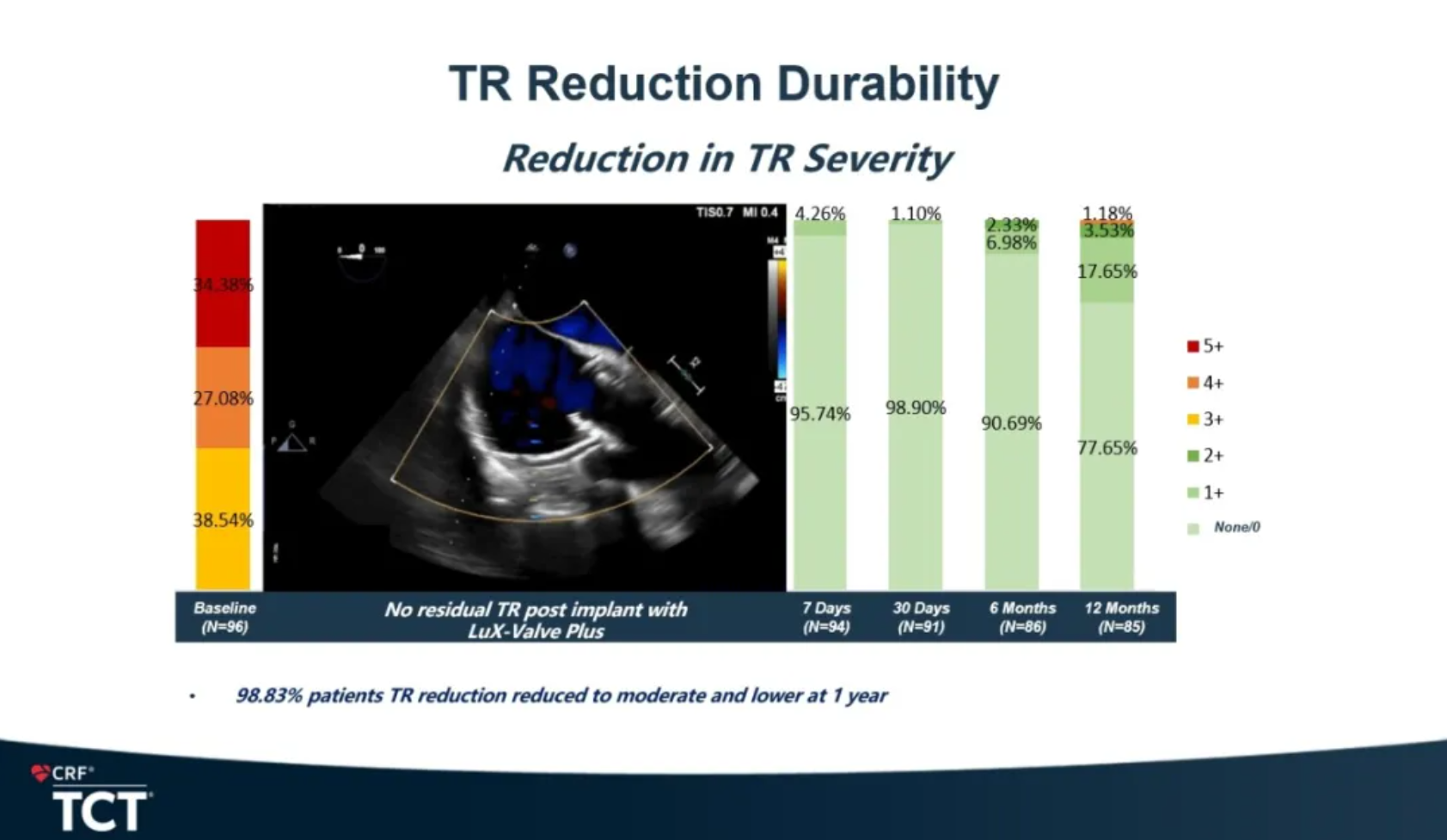 有效性結(jié)果顯示,患者的反流等級、心功能等級,以及生活質(zhì)量顯著改善。95.30%的患者在一年期時(shí)顯示無中度及以上反流。同時(shí),根據(jù)超聲數(shù)據(jù)顯示,患者右心系統(tǒng)重構(gòu)也獲得受益。