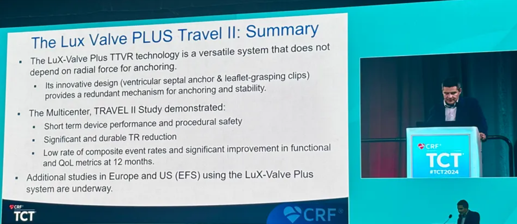 在2024年倫敦心臟瓣膜病介入治療會(huì)議(PCR London Valves 2024)的最新突破性研究章節(jié)(Late-Breaking Trials)中,由來自法國波爾多大學(xué)醫(yī)院(CHU de Bordeaux, Bordeaux, France)的Thomas Modine教授分享了LuX-Valve Plus在全球超400例的大尺寸瓣環(huán)患者植入情況,并重點(diǎn)結(jié)合了剛公布的LuX-Valve Plus TRAVEL II臨床試驗(yàn)研究中,瓣環(huán)直徑在50mm及以上患者的一年期隨訪數(shù)據(jù)。他表示非常高興能看到LuX-Valve Plus能滿足大瓣環(huán)患者的需求,因?yàn)榇蠖鄶?shù)大瓣環(huán)患者無法接受T-TEER術(shù)式,同時(shí)目前市場上的產(chǎn)品也無法完全滿足他們的需求,能看見這些由于解剖結(jié)構(gòu)暫時(shí)無法得到治療的患者得到幫助非常重要。而數(shù)據(jù)結(jié)果也顯示了,LuX-Valve Plus在TRAVEL II研究里大瓣環(huán)患者的應(yīng)用中,器械成功率高達(dá)98.64%,患者三尖瓣反流等級持續(xù)改善,心功能等級和生活質(zhì)量持續(xù)提升。
