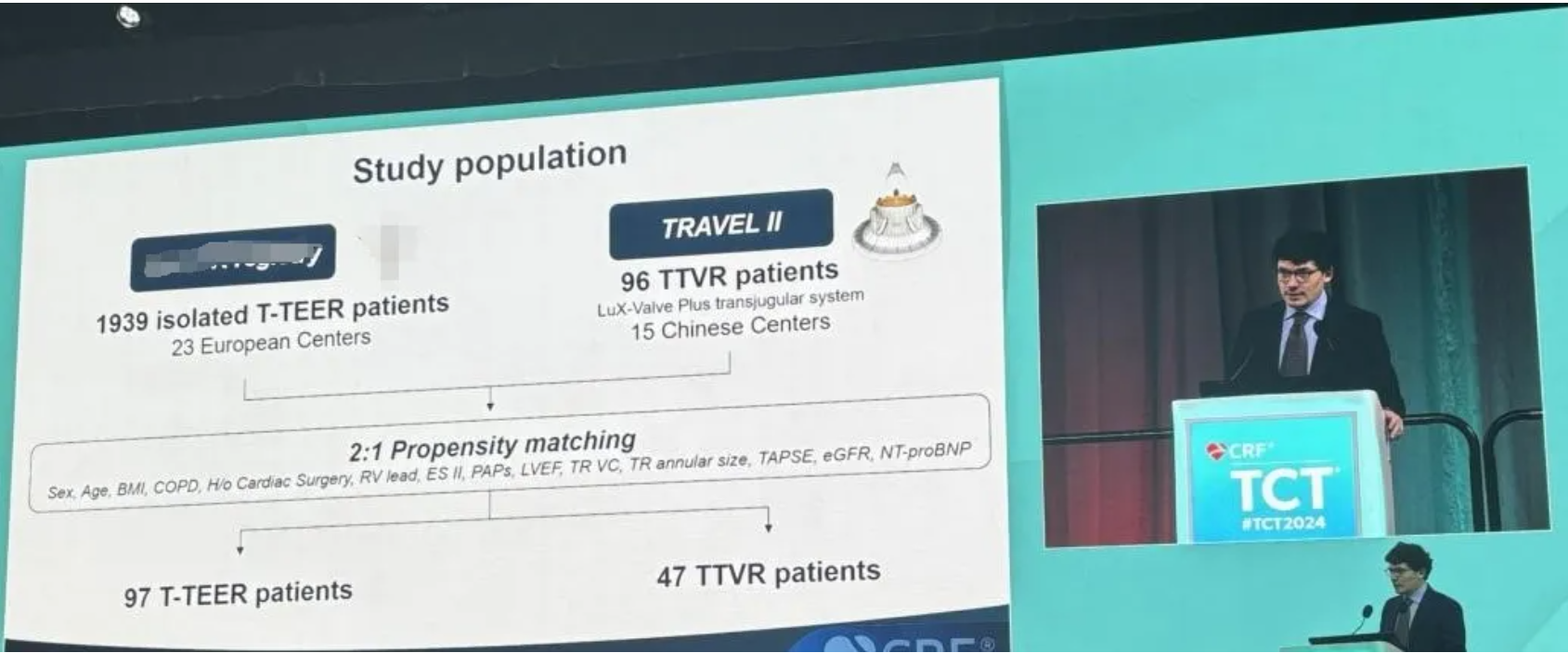 此外,來自美國心血管研究基金會(huì)(Cardiovascular Research Foundation, New York, U.S.)的Guido Ascione博士進(jìn)行了一項(xiàng)有癥狀的三尖瓣反流高?;颊逿-TEER與TTVR的一年臨床結(jié)果的傾向評分匹配分析。研究和分析中發(fā)現(xiàn),在以LuX-Valve Plus TRAVEL II一年期隨訪數(shù)據(jù)作為TTVR數(shù)據(jù)的引用的背景下,TTVR相對于T-TEER在三尖瓣反流問題解決層面有著更高的術(shù)式成功率,且一年后的臨床結(jié)果和功能評分中,置換和緣對緣相比并無統(tǒng)計(jì)學(xué)差異。