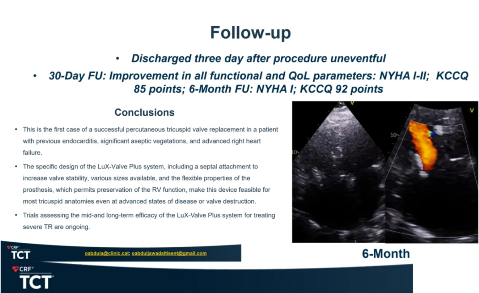 隨訪數(shù)據(jù)顯示,所有功能性和生活質(zhì)量指標(biāo)都有提升。30天數(shù)據(jù)顯示患者心功能從原來的NYHA III級回到I/II級,KCCQ評分提升37分;六個(gè)月期隨訪數(shù)據(jù)顯示心功能改善至NYHA I級,KCCQ評分提升42分。最后,這位術(shù)者總結(jié)道,這是一例成功用于患有心內(nèi)膜炎,嚴(yán)重?zé)o菌性贅生物以及晚期右心衰竭的患者的經(jīng)皮的三尖瓣置換手術(shù)。LuX-Valve Plus獨(dú)特的設(shè)計(jì),包括室間隔錨定,40-70mm可選的多樣型號,讓這款產(chǎn)品能應(yīng)對各種非常挑戰(zhàn)的三尖瓣解剖結(jié)構(gòu)。